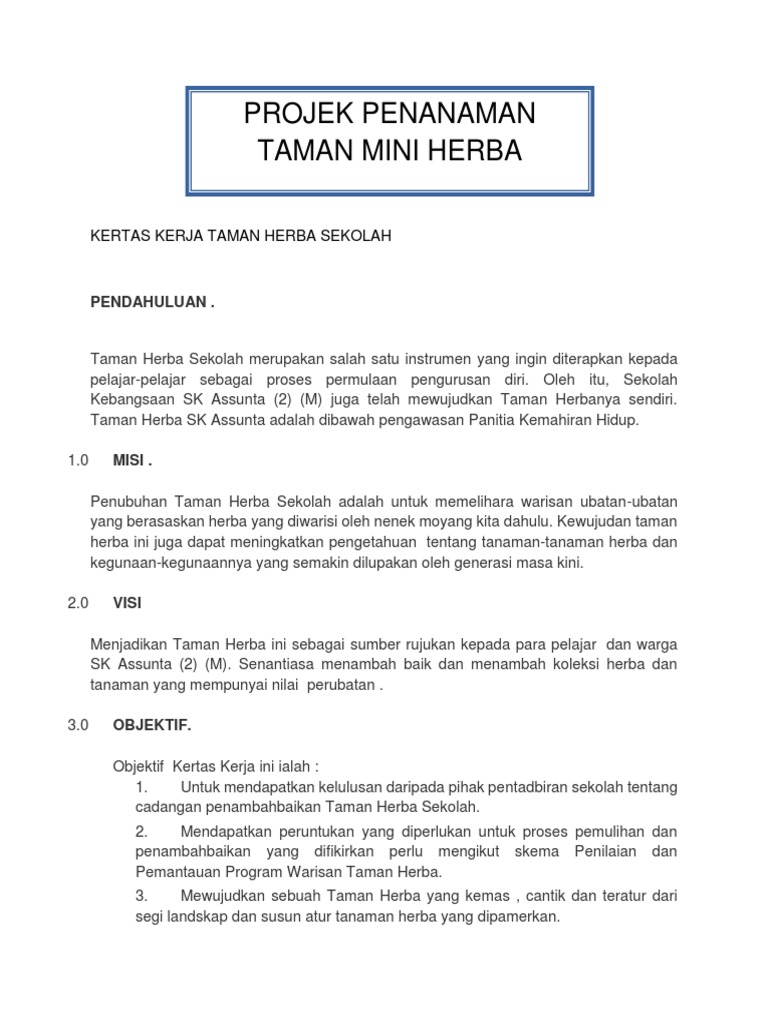 Taman Herba atau Taman Sains merupakan salah satu instrumen yang dinilai di dalam instrumen penilaian Bilik Sains di peringkat daerah dan. Download Contoh Kertas Kerja. 33 Contoh Kertas Kerja Perniagaan 1.